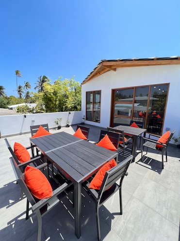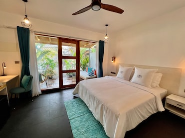 The hotel is extremely clean, and the entire staff, especially Riswaan, is incredibly kind. I stayed in the Deluxe Garden Villa, which was recently built. It is impeccable, but I also had the chance to visit the other rooms, and they are all very spacious and spotless. The bathroom is a great size, and the shower has perfect water pressure. All the power outlets are designed to accommodate different plug types.